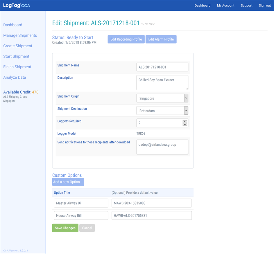 - Changing recording and alarm profiles associated with the shipment. This is only available until you have attached the first recorder to the shipment.