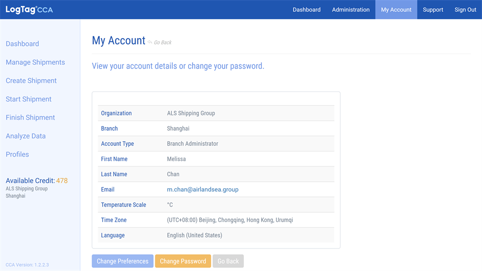 When you click My Account from the top menu you will see the details of your user account in LogTag® Cold Chain Analyzer on the My Account page: