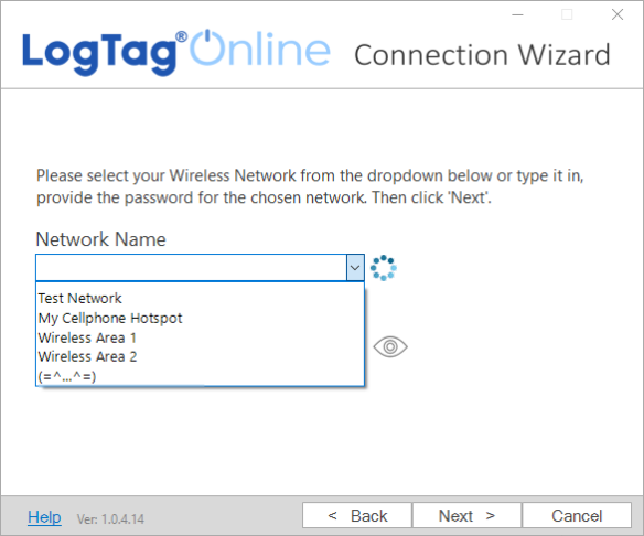Click the arrow for the Network Name to reveal a list of discovered wireless networks. Note: The network discovery process can take up to 2 minutes. Please wait while the scan is in progress.