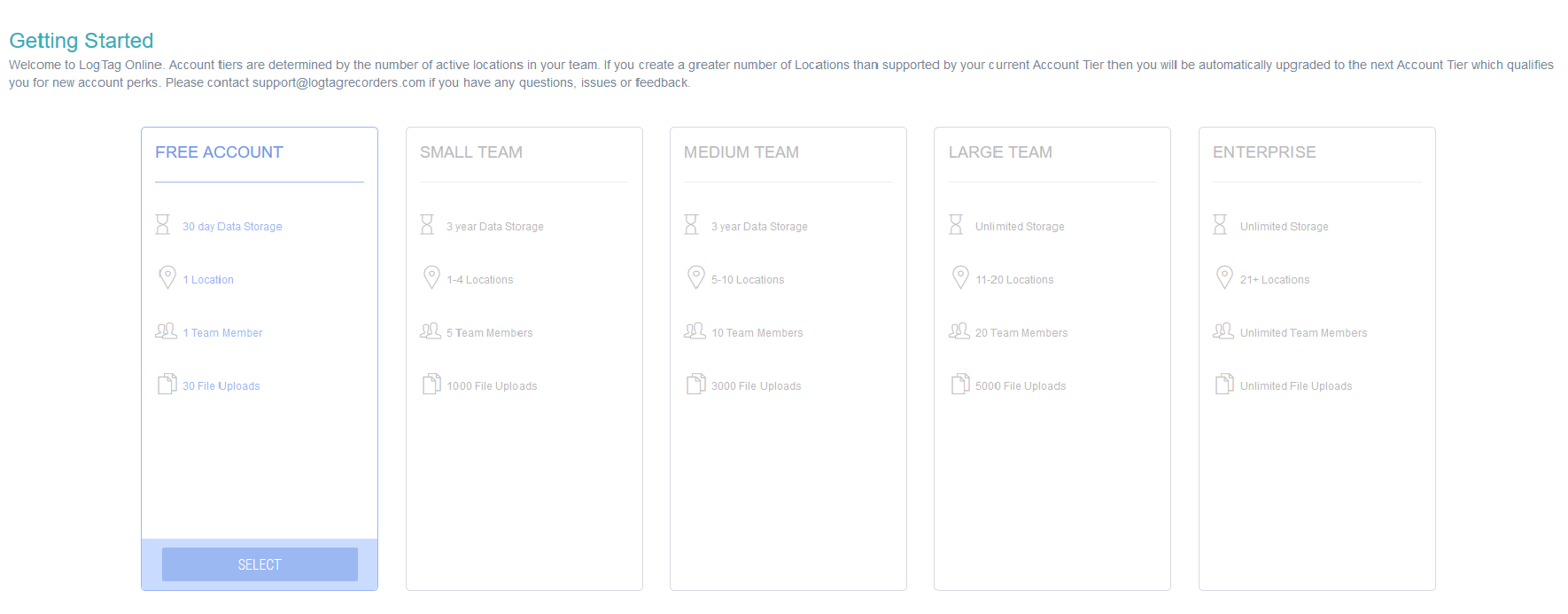 At this stage, only the free account tier can be selected. You can, however, add more locations by entering activation codes in your account. Please see Activation Codes for more details.