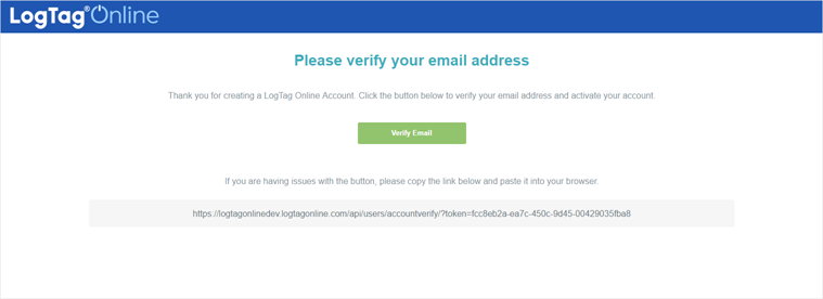 The LogTag® Online system has sent an automated email to the address you entered during account creation to make sure you created the account using a valid email address. You can only use your LogTag® Online account after we have confirmed you can collect this message from your email account, as we need to be able to send notifications, password reset information and other system generated messages.